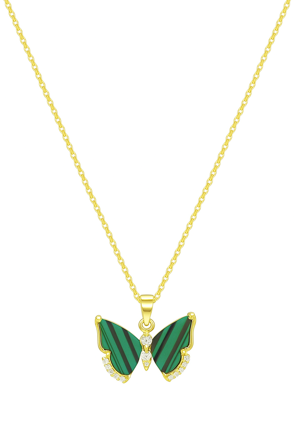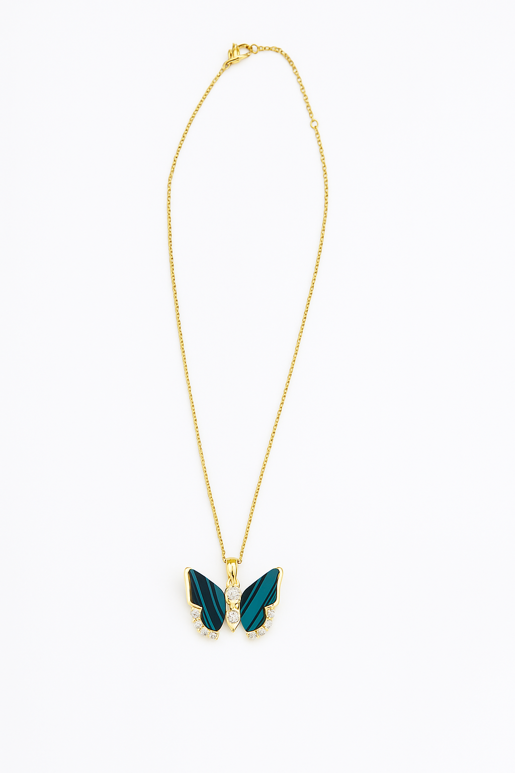 This stunning butterfly pendant necklace beautifully captures the essence of elegance and freedom. Crafted with a delicate golden chain, it features a charming butterfly design with deep green enamel wings outlined in gold and accented with sparkling stones. The graceful detailing adds a luxurious yet subtle charm, making it perfect for both everyday wear and special occasions. A timeless piece that symbolizes beauty, transformation, and confidence β this necklace effortlessly enhances any outfit with its radiant allure.