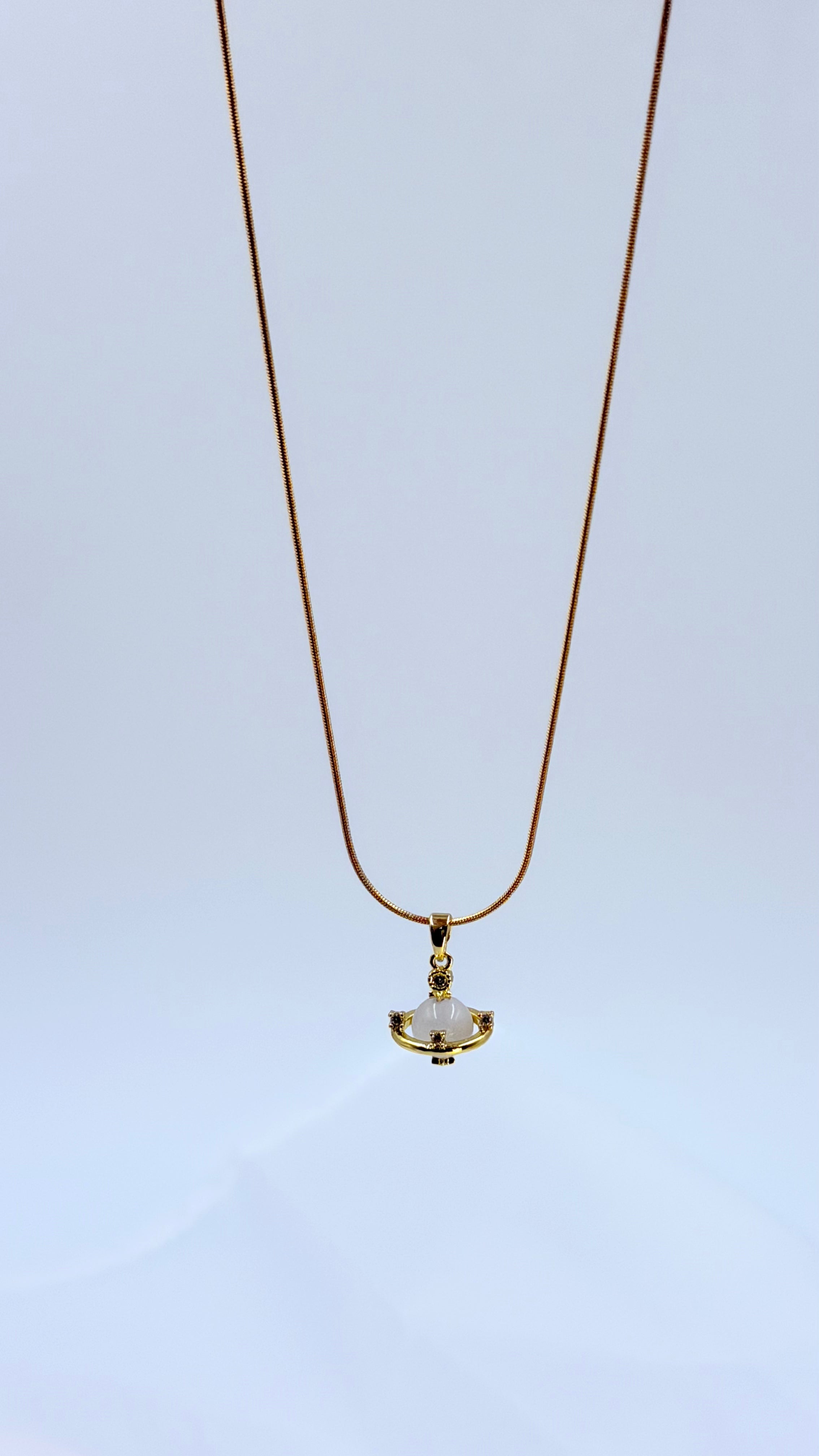 This elegant imitation necklace captures the beauty of timeless sophistication. Featuring a delicate golden snake chain, it gracefully holds a stunning pendant designed like an orbit, symbolizing endless charm and balance. The centerpiece, adorned with a lustrous pearl-like gem, radiates subtle elegance, while the intricate golden detailing adds a modern yet classic touch. Perfect for both everyday wear and special occasions, this piece complements every outfit with its graceful shine and luxurious finish.